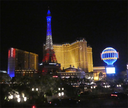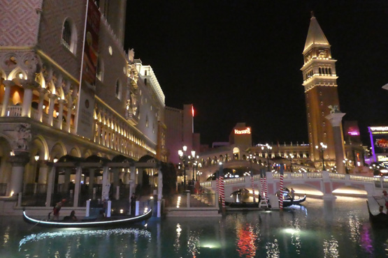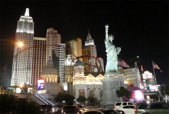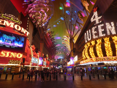 So nett der Nachtplatz ist, so übel ist die Nacht. Ich krieg im Liegen keine Luft und im Sitzen kann ich nicht schlafen. Ich denke, ich habe Wasser auf der Lunge. Nachdem ich ein paar Stunden im Sitzen mehr gedöst als geschlafen habe, werfe ich mir eine ordentliche Dosis eines Diuretikums ein (es geht nichts über eine gut sortierte Reiseapotheke!) und nach zwei oder drei Stunden habe ich drei Liter Wasser ausgeschieden, die Fahrt nach Las Vegas ist von häufigen Pinkelpausen unterbrochen. Kurz vor Vegas machen wir einen Abstecher in das Valley of Fire, wo es, no na, rote Sandsteinformationen zu sehen gibt. Die Besichtigung erfolgt aus dem Auto, bei 44 Grad (die bisher höchste gemessene Temperatur auf unserer Weltreise) überlegt man sich's, ob man aussteigt. In Las Vegas fahren wir den Strip entlang, einmal runter und einmal rauf, und beziehen dann unser direkt an der Fremont Street gelegenes Hotel. Die Rezeption ist vor lauter Spielautomaten, die dicht aneinander stehen, kaum zu finden. Unser Zimmer im 22. Stock ist angenehm kühl und wartet mit zwei riesigen Doppelbetten auf. Wir schlafen eine Weile (hurra, ich kann wieder im Liegen schlafen!), machen uns frisch, essen gut zu Abend in einem Barbeque-Restaurant in der Fremont Street und fahren dann mit dem Doppeldeckerbus auf den Strip, eine Aneinanderreihung von Themenhotels, da steht die Sphinx (mit Nase!), hier der Eiffelturm und da wurde Venedig nachgebaut, dazwischen gibt es Gärten, Seen, Brunnen mit Fontänen, Bars, wahnsinnig viel riesige Leuchtreklame und vor allem viele Leute. Die Luft ist auch nachts heiß, der Wind fühlt sich an wie aus dem Föhn. Wenn man sich abkühlen will, geht man wo rein, jedes Hotel hat Casinos mit tausenden Spieltischen und Spielautomaten, in die Menschen mit stumpfen Gesichtern ihr Geld einwerfen. Gerade um Mitternacht erreichen wir wieder die Fremont Street, eine überdachte Straße mit Bars, Lokalen und vor allem Casinos. Die gewölbte Überdachung der Straße ist ein riesiger 450 Meter (!) langer Videoschirm, auf dem jeweils zur vollen Stunde eigens für diesen produzierte Videos mit Sound, den man bis in die Knochen spürt, ablaufen. Da winden sich Schlangen über einem, dann hat man einen Blick in den Sternenhimmel und weiter ins Universum und schließlich fliegt eine Saturn-Rakete mit lautem Getöse über die Fremont Street. Km 359/10.656/154.272.