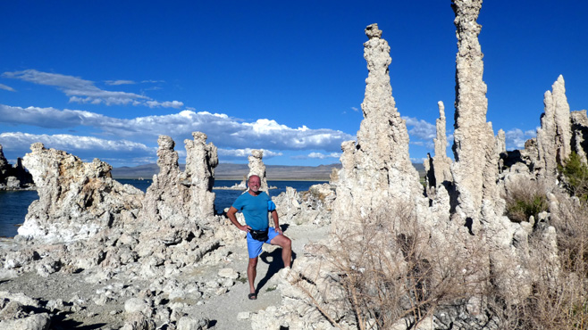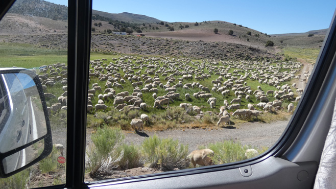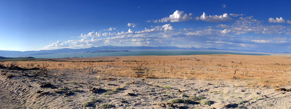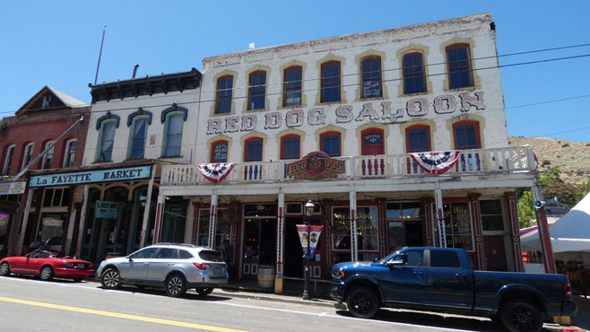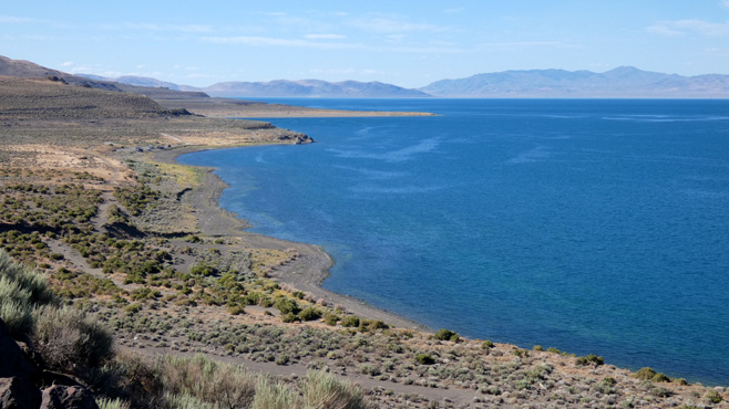 Das Wasser des Lake Tahoe ist kristallklar, am liebsten würde man hineinspringen, doch es ist ein Gebirgssee, sein Wasser ist ungemütlich kalt, in der Ferne sieht man noch Schnee auf den Gipfeln der Sierra Nevada. Wir passieren die Grenze zu Nevada und schon gibt es die ersten Casinos. In Carson City, der unscheinbaren Hauptstadt Nevadas, frischen wir unsere Vorräte auf. Zu Mittag machen wir Halt in Virginia City, einer der authentischsten Westernstädte, die wir kennen. Am Wochenende laufen hier Leute, die gerne mal einen Tag oder zwei in der Vergangenheit leben möchten, in historischen Kostümen herum, so manch einer hat einen Colt umgeschnallt oder trägt eine Winchester, die Ladies tragen Petticoats, in den Saloons spielt Live-Musik (gesehen 2012). Leider nur am Wochenende. Über Reno geht es zum Pyramid Lake, einem 40 Kilometer langen, in der Wüste Nord-Nevadas gelegenen See. Im Gegensatz zum bewaldeten Lake Tahoe gibt es hier kaum Bewuchs. Im See scheinen Fische zu leben, denn es gibt Möwen und Pelikane. Die Wassertemperatur liegt vermutlich über 20 Grad, ein Bad ist eine herrliche Abkühlung von der Hitze des Tages, 33 Grad. Wir übernachten abseits der Straße nach Gerlach neben eigenartigen Gesteinsformationen. Km 289/12.609/156.225.