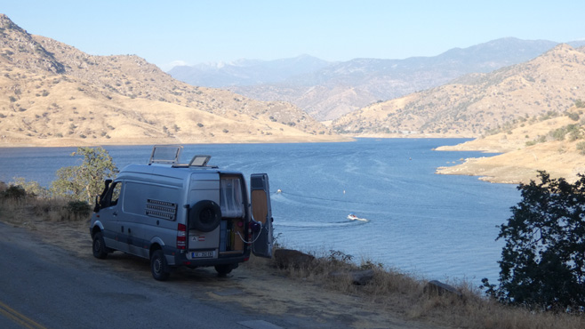 In der Früh ist es kurz ganz gut auszuhalten im Freien, doch dann setzt wieder der Föhnwind1 ein und wir sind froh, dass wir die Wüstenlandschaft des nördlichen Death Valleys aus dem Auto bestaunen dürfen. Aber immerhin klettert heute das Thermometer kaum mehr über 40. Mehrmals geht es über kleine Gebirge, bis wir die Mojave-Wüste erreichen. Hier werden mancherorts Bodenschätze abgebaut, etwa Natriumcarbonat, außerdem hat man auf vielen Quadratkilometern (!) Photovoltaikanlagen aufgestellt und andernorts viele hunderte Windräder. Es geht über einen letzten Gebirgsrücken und plötzlich ist die Wüste aus, trockenes Gras bedeckt den Boden, bald darauf sind wir in der Ebene Südkaliforniens, wo intensive Bewässerung riesige Weingärten und endlose Orangenplantagen ermöglicht. Wir umfahren die südlichen Ausläufer der Sierra Nevada, um auf deren Westseite nordwärts zu fahren. Wir übernachten mit Blick auf den Lake Kaweah, einen der Stauseen, von denen das viele Wasser für die Plantagen kommt. Km 535/11.485/155.101.