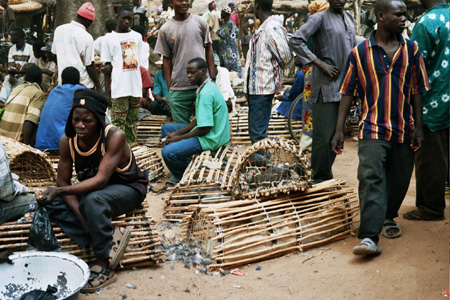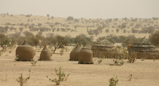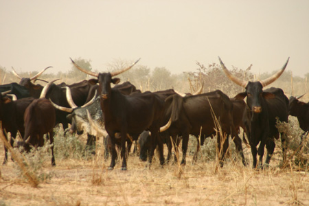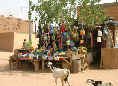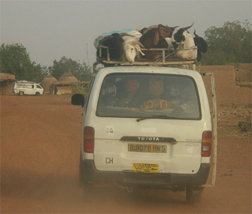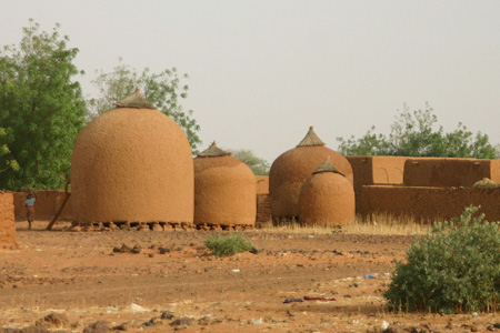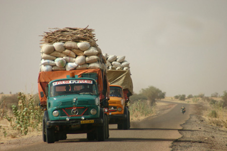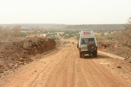 Heute ist ein langweiliger Fahrtag durch relativ eintönige Savannenlandschaften. Sind es anfangs nur einfache Hütten, die die Menschen beherbergen, treten im Verlauf der Fahrt nach Südwesten Lehmhäuser an ihre Stelle, zunehmend von Speichern, ebenfalls aus Lehm, umgeben. Unzählige Schaf-, Ziegen-, Rinder- und Eselherden ziehen durch die Gegend und vielfach laufen die Tiere ohne Scheu über die Straße. In den Dörfern werden Holz, Zwiebeln und Tomaten zum Verkauf angeboten. In einem unbedeutenden Dorf essen wir zu Mittag. Es gibt nur ein Gericht: Reis mit Fleisch und Sauce. So ein Zufall, genau das wollten wir ohnehin bestellen. Es schmeckt nicht schlecht, doch als sich Susi von ihrem Essen beobachtet fühlt, stellen wir fest: Das ist ein Augen- und Ohrenschmaus im wahrsten Sinne des Wortes! Kein Wunder, dass wir das HNO-Risotto nicht ganz aufessen! Nun versucht der Wirt noch, uns übers Ohr zu hauen: Er will 500 CFA (75 Cent) fürs Essen (das scheint ja noch OK) und 500 für jedes Getränk (das ist wohl doch ein wenig ortsunüblich). Unser Einspruch erhält unerwartet Verstärkung, indem ein anderer Gast des Lokales den richtigen Preis nennt: 300 je Essen und je Getränk. Wir übernachten in einem Respektabstand von ca. 15 Kilometern von der nigerianischen Grenze. Beim Kochen bemerken wir schwarze Partikel in unserem Leitungswasser. Der Magnettest zeigt, dass es sich um Einsenspäne handelt. Geht unsere Wasserpumpe ein oder stammen die Späne aus dem letzten Brunnen?
