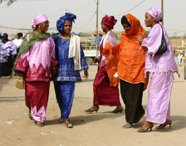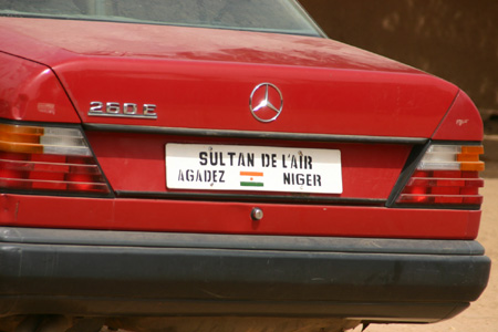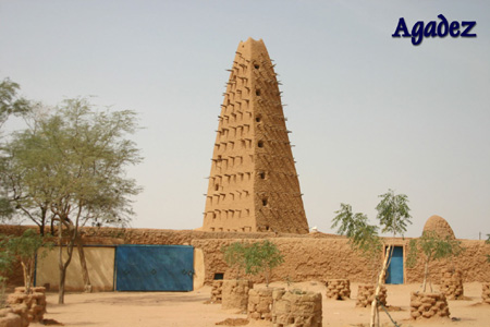 Erste, von Hirten errichtete Strohhütten kündigen die nahende Stadt an. Der Vorort, den wir passieren, unterscheidet sich mit Ausnahme der hier vorhandenen Stromleitungen nicht von den abgelegenen Dörfer, die wir durchfahren haben. Das Stadtzentrum von Agadez ist ebenfalls staubig, Asphalt kennt man hier nicht, aber es gibt einfache Geschäfte, die anscheinend hauptsächlich staubiges buntes Plastikgeschirr verkaufen, und viele der typischen westafrikanischen Lehmbauten. Auf den Straßen flanieren elegante Menschen. Besonders gefallen uns die bunten Kleider der Frauen. In kleinen Gruppen stehen vermummte Tuareg beisammen, daneben ihre Kamele mit den typischen Sätteln. Wir treffen auf das erste Internet-Cafe seit Sebha in Libyen und können dort endlich unseren Reisebericht hochloaden. Leider kommt eine Verbindung erst nach unzähligen Anwahlversuchen zustande, ist furchtbar langsam und reißt auch mehrmals ab, sodass wir nur Text hochladen können. Die Bilder folgen bei nächster Gelegenheit, hoffentlich in Niamey. In Agadez essen wir zu Mittag recht gut in einem Restaurant. Ein Coca-Cola kostet 300 CFA (45 Cent), ein Essen zwischen 600 (90 Cent) und 1000 (1,5 Euro). Nachdem wir uns die große Moschee und den Sultanspalast angesehen haben, versorgen wir uns mit Obst, Gemüse und Getränken (es gibt französischen Wein!). Als wir versehentlich gegen eine Einbahn fahren (das Schild vor dem Schiverleih hätte jeder übersehen), werden wir von einem Polizisten auf einem Moped verfolgt. Er hält uns an, kontrolliert alle denkbaren Papiere und will ein Bußgeld von 8.000 CFA (12 Euro). Das ist nun aber doch etwas zuviel! Zunächst weigere ich mich, überhaupt etwas zu bezahlen, da der Polizist ziemlich betrunken ist. Da der Gesetzeshüter aber ziemlich hartnäckig ist und Karin der Überzeugung ist, dass auch betrunkene Polizisten im Recht sind, biete ich 2.000 CFA und schließlich einigen wir uns auf 3.000, nach deren Empfang er salutiert und schwankend auf sein Moped zugeht. Nun geht es auf großteils guter Asphaltstraße weiter in Richtung Niamey. Für die 940 Kilometer ist 2.500 CFA (3,75 Euro) Maut zu bezahlen. Heute hat das Thermometer erstmals 40 Grad überschritten. Es gibt mächtig viele Fliegen und Nachtfalter.