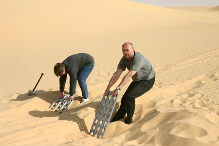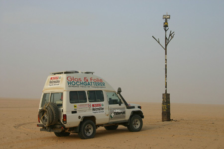 Kaum zu glauben, aber heute ist es nebelig! Während wir frühstücken, fallen Kinder wieder über unseren Müll her, streiten sich um leere Flaschen und Becher, betteln um Kugelschreiber und Bonbons, beides ist uns schon längst ausgegangen. Nach der Reparatur unserer Wasseranlage (Sand hat die Messingkupplungen undicht gemacht) besichtigen wir die Altstadt von Fachi mit ihrer Speicherburg und brechen dann wieder in die Wüste auf. Heute folgen wir bequemerweise den Spuren einer Gruppe Franzosen mit einheimischem Führer, die kurz vor uns Fachi in Richtung Agadez verlassen hat. Den ganzen Tag ist es dunstig und wir sanden häufig ein, weil wir aufgrund der schlechten Sicht den Boden falsch einschätzen. Die Spuren der Franzosen zeigen, dass es ihnen nicht anders ergeht. Zu Mittag fährt Karin in eine tiefe Querrinne, wobei sich der Gepäckträger verbiegt und der Windabweiser kaputt geht. Am Nachmittag bleibt sie im Sand stecken und als wir umdrehen, um zu sehen, wo sie bleibt, bleiben auch wir stecken. Es dauert über eine Stunde, bis Susi und ich den Wagen wieder auf tragendem Boden haben und bei Karin eintreffen. Als auch sie befreit ist, geht es weiter zum Arbre du Ténéré. Hier ist bis 1973 der einzige Baum im Umkreis von hunderten Kilometern gestanden. Die Akazie war ein weithin bekannter Orientierungspunkt, bis sie von einem Lastwagenfahrer "versehentlich" umgefahren wurde. Auch wenn der Baum nun im Museum von Niamey steht, ist er auch heute noch in allen Landkarten (sogar bis zum Maßstab 1:4 Millionen) eingezeichnet; es ist auf den Karten dort ja auch genügend Platz, weil weit und breit sonst nichts ist. Heute steht an dem Platz ein Metallbaum und ein metallenes Kunstwerk eines Japaners. Außerdem befindet sich dort ein 30 Meter tiefer Brunnen.