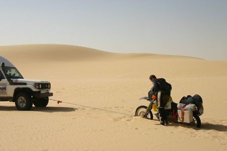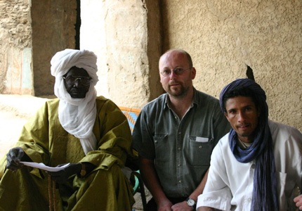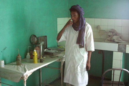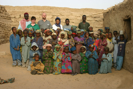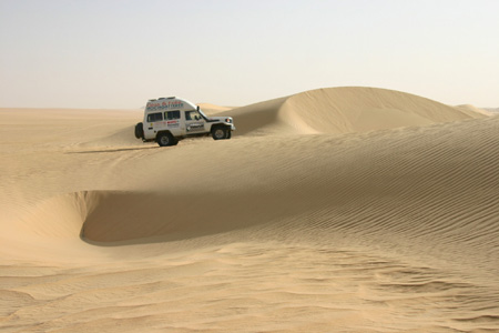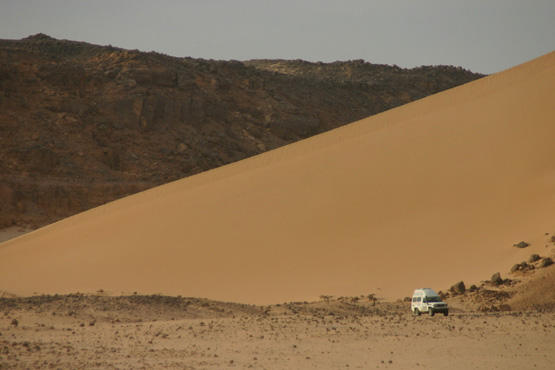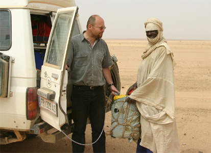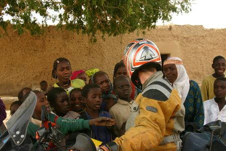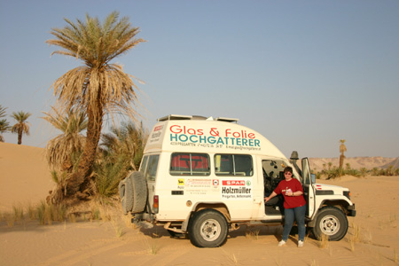 Wir stehen täglich konsequent um 6 Uhr auf, um die elf Stunden Tageslicht von ca. 7 bis ca. 18 Uhr optimal zu nützen, denn die Dämmerungsphasen sind sehr kurz. Heute brechen wir zur Durchquerung einer der abgelegensten und trockensten, aber auch schönsten Sahararegionen, der Ténéré, auf. Wir rechnen mit etwa zwei bis drei Tagen für die knapp 500 Kilometer bis Agadez. Bewegen wir uns anfangs noch auf einer Piste oder zumindest auf einem Spurenbündel, verzweigen sich die Spuren zunehmends, werden undeutlicher und verschwinden schließlich. Wir sind auf uns allein gestellt. Zwischen zwei unendlich scheinenden Dünenzügen fahren wir zügig dahin, allerdings sind mehr als 80 km/h kaum möglich, weil die Sicht schlecht ist und man Bodenunebenheiten kaum wahrnehmen kann. Mehrmals bremsen wir vor vermeintlichen Wellen ab, aber es geht vollkommen eben weiter. Umgekehrt werden wir durch Querrinnen, die nicht erkennbar waren, immer wieder kräftig durchgeschüttelt. Die Landschaft wechselt kaum, es gibt nur Sand. Rechts eher eben, links mehr in Form von Dünen. Fahrzeugspuren tauchen nicht mehr auf, dafür gibt es reichlich Kamelkot und alle paar Kilometer ein totes Kamel. Nach etwa 120 Kilometern Richtung Westen erkennen wir, dass wir nicht, wie das sein sollte, auf die Oase Fachi zusteuern, sondern den Ort um ca. 30 Kilometer nördlich verfehlen. Wir studieren alle verfügbaren Landkarten, werden jedoch nicht schlau daraus, nicht einmal die französischen Detailkarten im Maßstab 1:200.000 helfen. Sie zeigen nur Dünen in West-Ost-Richtung. Erst das Studium einer Routenbeschreibung bringt die Lösung: Wir befinden uns nicht auf der üblichen Route, sondern auf der Karawanenstrecke, die etwas nördlicher verläuft und "landschaftlich sehr interessant" ist. Doch die Karawanen umgehen Fachi im Norden, wie wir feststellen, und weil wir nicht wissen, ob die Route weiterhin so gut befahrbar ist, beschließen wir, die Strecke zu verlassen und Fachi direkt anzusteuern. Dazu müssen wir etliche Dünenzüge mühsam überqueren. Am späten Nachmittag haben wir es dann geschafft: Wir melden uns am Polizeiposten in Fachi. Die Beamten schreiben uns in ihr Buch und verlangen dafür ungerechtfertigter Weise 2.000 CFA (3 Euro). Wir zahlen aus Prinzip nicht, außerdem werden Karins mitgebrachte CFA knapp: Wir sind zwar schon seit Tagen im Land, aber eine Bank oder eine Wechselstube gibt es vor Agadez nicht. Mit einer kleinen Menge Schnaps geben sich die Polizisten auch zufrieden. Wir sehen uns nun das Ortszentrum an und sind sofort von bettelnden Kindern umringt. Aus dieser Belagerung rettet uns der Arzt des Dorfes, indem er uns zur Besichtigung seines Krankenhauses einlädt. Das Gebäude ist relativ groß, verfügt über Warteraum, Sprechzimmer, Injektionsraum, Notfallraum, Geburtsraum und ein Krankenzimmer mit vier Betten. Die Diagnostik allerdings scheint mit einem Blutdruckmesser und einer Taschenlampe erschöpft zu sein. Auch die therapeutischen Möglichkeiten sind sehr bescheiden und der Blick in einen Plastiksack, der die Krankenhausapotheke darstellt, macht irgendwie betroffen, denn unsere Reiseapotheke ist besser ausgestattet. Als ich dem Doktor eine Schachtel eines sehr starken Schmerzmittels überreiche, ist er hocherfreut und würdigt unsere Spende damit, dass er uns dem Dorfchef und dem Iman vorstellt. Während die Begegnung mit dem geistlichen Oberhaupt des Dorfes aus einem freundlichen Händeschütteln und ein paar Höflichkeitsfloskeln besteht, wächst die Audienz beim Dorfchef zu einem Spektakel aus: Wir dürfen zu Füßen des alten Mannes am Boden Platz nehmen und der Arzt erzählt ihm auf französisch, dass er von uns ein sehr starkes Schmerzmittel für seine Patienten erhalten hat. Uns berichtet er nun, dass er dem Dorfoberhaupt erzählt hat, dass er für seine Patienten ein sehr starkes Schmerzmittel erhalten hat. Karin übersetzt nun uns auf Deutsch, dass der Mediziner dem Dorfchef berichtet hat, dass er für seine Patienten ein starkes Schmerzmittel erhalten hat. Nun sagt der Dorfchef dem Doktor, dass er sich für die Spende bedankt und uns bittet, nach unserer Rückkehr warme Kinderkleidung zu schicken. Der Arzt wiederum berichtet, dass sich der Dorfchef für die Spende bedankt hat und uns bittet, nach unserer Rückkehr warme Kinderkleidung zu schicken, was Karin nun noch ins deutsche übersetzt. Die Ehre wird nun noch übertroffen, indem der Lehrer von Fachi für ein Foto mit uns seine Schulkinder außer Plan zusammenruft.