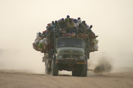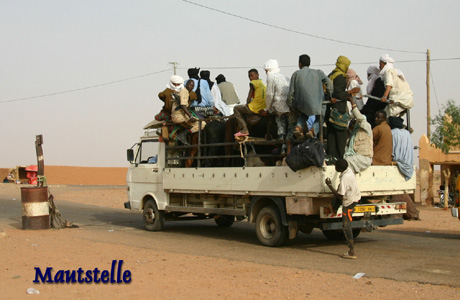 Zu Mittag erreichen wir Dirkou, wo wir die noch ausständigen Einreiseformalitäten bei Gendarmerie und Zoll erledigen. Die Beamten sind ausnahmslos freundlich und plaudern mit uns. Gegen eine Gebühr von 5.000 CFA (7,5 Euro) erhalten wir ein Laissez passer; auf dem Beleg stehen allerdings nur 3.000. Im Restaurant lassen wir uns Sardinen mit Erbsen und ein Omelett schmecken, dazu ein fast kaltes Cola. Für das Essen und die Getränke bezahlen wir drei zusammen ca. 4.000 CFA (6 Euro). Treibstoff wird uns von 6.000 (9 Euro) bis 12.000 CFA (18 Euro) je 20 Liter angeboten. Es lohnt sich also ein Preisvergleich. Im Diesel schwimmt allerlei Müll, weswegen ich den Treibstoff nicht ungefiltert in den Tank lasse. Der anschließende Bummel durch die Gassen von Dirkou gibt Karin recht, die, während wir in Libyen waren, immer meinte "Wenn wir dann in Afrika sind...": Afrika beginnt erst hier! Dachten wir bisher, Nordafrika wäre eine andere Welt, so müssen wir uns eingestehen: Hier sind wir schon wieder in einer anderen Welt, in der dritten also! Dirkou mit schätzungsweise wenigen tausenden Einwohnern hat keine öffentliche Wasserleitung. Das Wasser wird aus Brunnenlöchern auf der Straße geschöpft und auf dem Kopf nach Hause getragen. Das Restaurant hat kein WC, es gibt kein Telefon. Es gibt kaum Autos, manche haben Fahrräder, die meisten Menschen gehen zu Fuß. Im Ortszentrum gibt es unzählige kleine Läden. Das Leben spielt sich Großteils auf der Straße ab. Die Kinder betteln nach Cadeaus und posieren für Fotos. Die Frauen hingegen drehen sich sofort von der Kamera weg und ziehen den Schleier hoch. Als wir vom Stadtbummel zurückkommen, malt gerade ein junger Bursch die Telefonnummer der Fa. Hochgatterer von unserem Auto ab. Ich hoffe, die liefern auch nach Afrika! Innerhalb der letzten beiden Tagen hat sich für uns auch ein Klimawechsel vollzogen: War es bisher unter Tags mit maximal 28 Grad und ein wenig Wind immer angenehm und nachts mit bis zu 3 Grad über Null recht kalt, so war es heute erstmals heiß (34 Grad) und die vergangene Nacht mit 19 Grad recht warm.