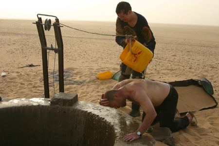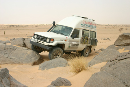 Auf dem letzten Abschnitt unserer Ténérédurchquerung wird es nun flacher, zunächst tritt spärlicher Bewuchs auf und schließlich wird es steinig und sogar felsig. Wir treffen einen der berühmten Sahara-Transporter, die erst abfahren, wenn sie wirklich voll beladen sind. Zweimal werden wir von Tuaregs um Wasser gebeten, kein Problem, da der Wassertank unter der Bodenplatte schätzungsweise noch 50 Liter enthält und wir morgen Agadez erreichen. Am Abend ist sogar noch für eine Dusche Wasser übrig, das sich allerdings auf der heutigen Fahrt auf knappe 40 Grad erwärmt hat!