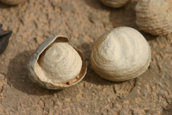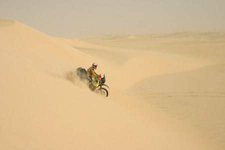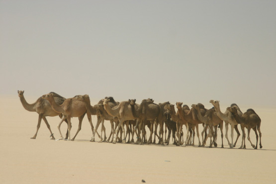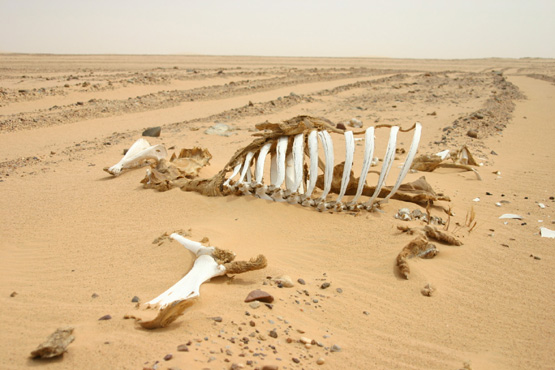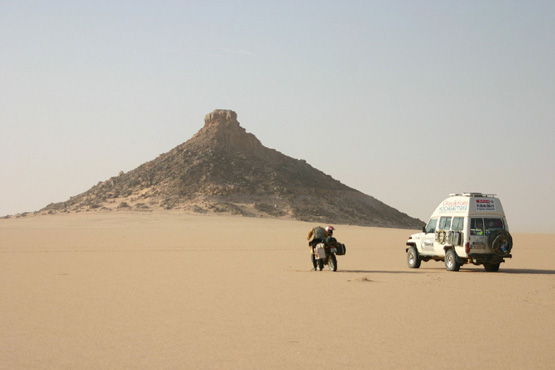 Heute ist ein sehr eintöniger Fahrtag. Die Piste ist meist sandig, aber gut befahrbar; die Landschaft wechselt wenig, ist anfangs eben, erst im späteren Verlauf tauchen niedrige Berge auf. Abwechslung gibt es, als wir zufällig neben der Piste mutmaßliche Dinosaurier-Eier finden und Gebilde, von denen wir glauben, dass es sich um Saurierknochen handelt. In Seguedine werden wir von bewaffneten Soldaten angehalten, weil wir einen Fotostop eingelegt haben, anstatt uns sofort beim Militärposten zu melden. Am Posten, den aufzusuchen wir genötigt werden, ist man zwar nicht sehr freundlich, hat aber Nachsehen mit unserem Verhalten und lässt uns mit einem Stempel im Pass ziehen. Kaum haben wir am Rand der Oase unser Lager aufgeschlagen, werden wir von Kindern umringt, die alles genau verfolgen, was wir tun. Die Burschen suchen sich aus unseren Küchenabfällen noch allerlei Brauchbares heraus, etwa das Grünzeug von Zwiebeln oder eine unansehnliche Tomate. Auch unsere gebrauchten Teebeutel werden ausgelutscht und aus einem leeren Milchpackerl werden noch die allerletzten Tropfen herausgesaugt.