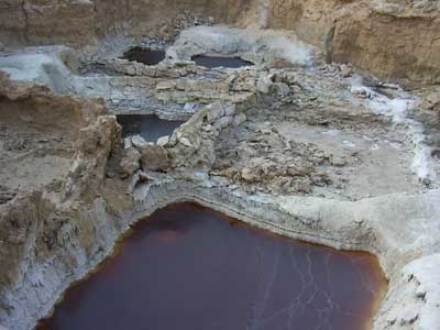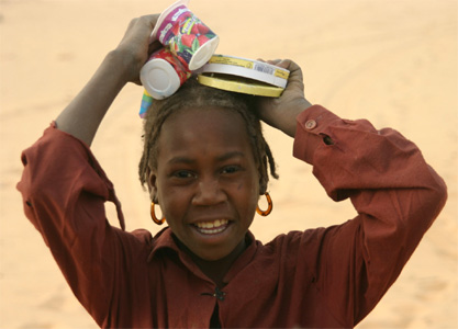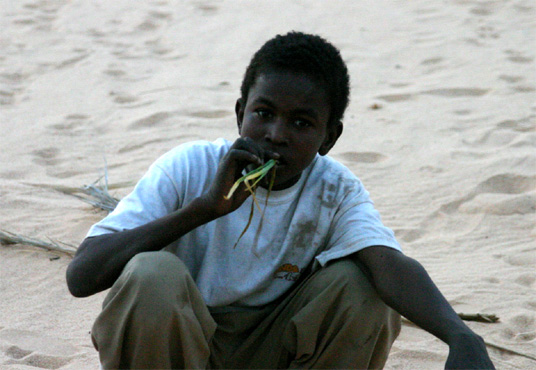 Wir sind immer bestrebt, keine Abfälle in der Wüste zu hinterlassen, sogar beim "Toiletten"-Besuch: Das Klopapier wird nicht mit den Exkrementen im Sand vergraben, weil es bei der Trockenheit nicht verrottet und irgendwann vom Wind wieder freigelegt wird und dann durch die Gegend flattert. Daher verbrennen wir das Toilettenpapier. Leider passiert mir heute ein Missgeschick, indem der Wind ein brennendes Stück Klopapier an eine Palme weht und den strohtrockenen Baum in Sekundenschnelle entzündet. Die Sache hat uns einen ziemlichen Schreck eingejagt und auch die Strafe lässt nicht lange auf sich warten: Ein zufällig (?) vorbeikommender Kameltreiber presst uns 15.000 CFA (23 Euro) ab, indem er mit einer Anzeige beim zuständigen Förster droht. Da wir nicht wissen, ob er nicht, trotzdem er Geld erhalten hat, Scherereien macht, brechen wir sofort nach Bilma auf. Von Bilma sind wir ein wenig enttäuscht, denn es gibt keinen Laden (oder konnten wir nur keinen finden?), kein Restaurant, keine Tankstelle, auch die berühmten Thermalquellen laden nicht zum Bad ein, weil das Wasser im "Schwimmbecken" ekelig dreckig ist. Wir können aber unseren Wasservorrat auffüllen und finden einen Bäcker. Im Schatten von Bäumen halten wir eine verlängerte Mittagsrast. Bald kommen ein paar Buben, die wir mit leeren Cola- und Konservendosen beschenken, die sie als Musikinstrumente benützen, und es dauert nicht lange, bis wir gemeinsam musizieren (Kostprobe). Ein selbsternannter Guide zeigt uns dann noch eine Saline etwas außerhalb der Stadt, wo wir auch übernachten wollen. Als ich ihn in die Stadt zurückbringe, will er ein Geschenk für seine Führung. Er gibt sich allerdings mit den von mir angebotenen Dingen nicht zufrieden und fordert Geld. Das kommt nun aber gar nicht in Frage und so fahre ich unter seinem heftigen Gezeter weg. Wir beschließen nun, doch nicht bei den Salinen zu übernachten, sondern draußen in der Wüste, denn man kann ja nie wissen, welch Unfug dem enttäuschten "Führer" einfällt. Und so befinden wir uns innerhalb von 12 Stunden schon zum zweiten Mal auf der Flucht.