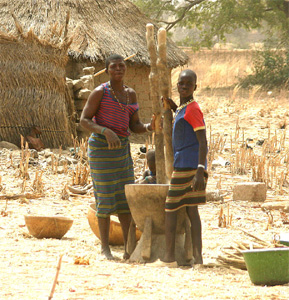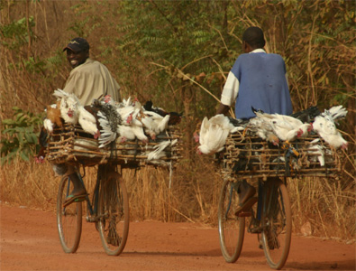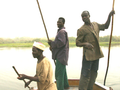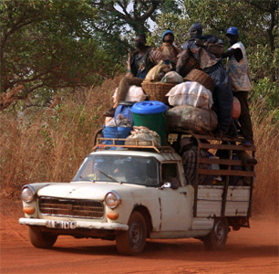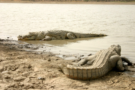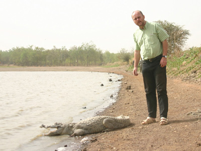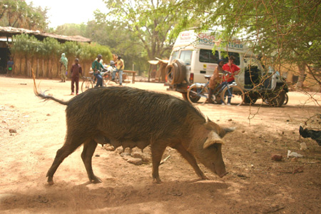 Am Morgen verabschieden wir uns von Karin und, da es in Ouagadougou keine Sehenswürdigkeiten gibt, verlassen die Stadt in Richtung Westen. Weil es noch zeitig in der Früh ist, kommt uns der Berufsverkehr in Form von tausenden Fahrrädern und hunderten Mopeds entgegen. In Sabou besuchen wir die "heiligen" Krokodile, die in einer Zahl von angeblich 100 in einem Teich wie im Schlaraffenland leben. Um sie zu sehen, muss man 1.500 CFA (2,25 Euro) bezahlen. Zudem kann man um 1.000 CFA (1,50 Euro) ein lebendes Huhn erstehen, das, an einer Schnur angebunden, den Reptilien zum Fraß angeboten wird. Deren Interesse ist aber eher gering, da sie stark überfüttert werden, vermutlich, damit sie die Haustiere (oder gar die Kinder) der umliegenden Einwohner nicht auffressen. Und tatsächlich suchen Schafe, Ziegen und Schweine den Teich als Tränke auf. Die Einwohner Burkina Fasos bestehen zu etwa 50 Prozent aus Moslems und 40 Prozent Christen. Daher sieht man hier, im Gegensatz zu den bisher bereisten vorwiegend islamischen Ländern, Schweine auf der Straße. Da die Tiere generell nicht in Ställen oder eingezäunten Weiden gehalten werden, sondern einfach herumlaufen und bestenfalls von einem Hirten beaufsichtigt werden, befinden sich neben Schafen, Ziegen, Rindern, Eseln, Hühnern, vereinzelt noch Kamelen, eben auch noch Schweine auf der Fahrbahn, was eine erhöhte Aufmerksamkeit beim Fahren erfordert. Am späten Nachmittag erreichen wir das Mare aux Hippopotames und wir hoffen, einige Flusspferde zu Gesicht zu bekommen. Wir lassen uns von einem Boot auf den See bringen und haben Glück: In wenigen Metern Entfernung liegen die Flusspferde im See. Leider kommen sie nicht heraus, heben nur dann und wann den Kopf aus dem Wasser. Wegen der vielen Mücken übernachten wir in einer Entfernung von ca. 15 Kilometern vom See im Busch. Es umgibt uns eine grandiose Geräuschkulisse: Vögel, Grillen, Mücken, Fliegen, ferne Musik aus einem Dorf. Jetzt, um 20.30 hat es noch 33 Grad, es ist absolut windstill und die Mücken sind trotz Insektenschutz lästig.