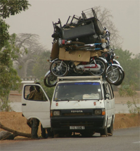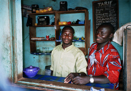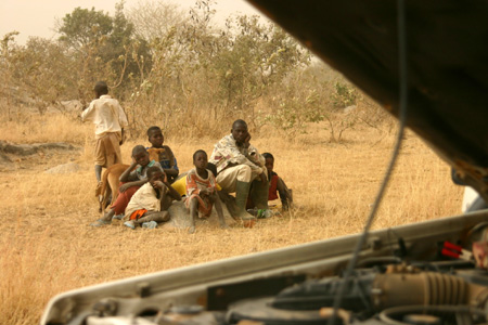 Schon zum wiederholten Mal sind wir im Fernsehen, wie Karin immer sagt: Weil die Menschen hier eben keinen Ferseher haben, nützen sie jede Möglichkeit, Nichtalltägliches anzusehen. Sie lassen sich in unserer Umgebung nieder und sehen einfach zu, was wir machen. Mal gibt es nur einen Zuseher, ein anderes Mal zehn oder zwanzig. Sie stehen oder sitzen in einigen Metern Entfernung von uns und beobachten genau, was wir tun, wie wir kochen, was wir essen und trinken, sind erstaunt, dass wir fließendes Wasser haben und sehen auch beim Duschen kurz zu. Am Anfang empfanden wir es ein wenig unangenehm, dass es dauernd Zuseher gibt, doch man gewöhnt sich rasch daran. Zu Mittag erreichen wir Ouagadougou, die Hauptstadt von Burkina Faso. Der Campingplatz macht einen derart unordentlichen Eindruck, dass wir uns nicht zum Bleiben entschließen können. Wir fahren ins Stadtzentrum und suchen die katholische Missionsherberge, wo Karin für die nächsten Tage eine Bleibe findet. Sie ist nun ja vorerst am Ziel. Sie wird hier einige Wochen bleiben und dann noch in die Elfenbeinküste fahren, wo sie einen Freund besuchen möchte. Zum Abschied lädt sie uns noch zum Abendessen in ein Restaurant ein. Die Nacht verbringen wir vor der Herberge im Auto. Es ist allerdings sehr laut, sehr heiß und es gibt viele Mücken.