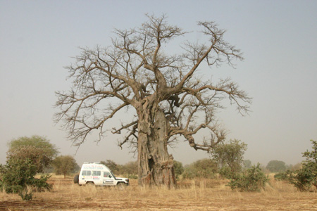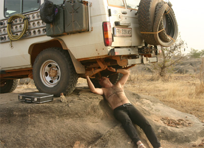 Da Einheimische häufig einen kleinen Grenzübergang am Rande des Nationalparks "W" benützen, versuchen auch wir, uns mit dem Übertritt hier einen Umweg über Niamey zu ersparen. Die nigrischen Ausreiseformalitäten finden praktisch nicht statt. Der Grenzbeamte wirft nur einen Blick in die Pässe und wünscht "Bonne route!". Weder erhalten wir einen Ausreisestempel noch wird das Laissez passer einbehalten bzw. Karins Carnet abgestempelt. Über eine sehr schmale Piste, die vorwiegend von Radfahrern benutzt wird, fahren wir über die Grenze. Die Einreiseformalitäten gehen rasch vonstatten (2,5 Stunden), auch wenn den Beamten wohl die Übung fehlt: Formulare müssen erst gesucht werden, der Stempel ist am Austrocknen und wie war das nochmal mit der Gültigkeit eines Visums? Wir sind das fünfte ausländische Fahrzeug, das heuer hier passiert; der letzte Eintrag im dicken Buch stammt vom 31. Jänner. Weiter gehts, zunächst auf ganz guter Piste, später auf sehr gutem Asphalt. Auch in Burkina muss auf Teerstraßen eine geringe Maut bezahlt werden. Auf der Fahrt nach Ouagadougou wird die Vegetation zunehmend üppiger, zahlreiche Affenbrot- und Mangobäume treten auf. Jahreszeitlich bedingt ist aber alles trocken, vieles verdorrt, die Felder abgeerntet. Das wenige Grün ist von einer dicken Staubschicht bedeckt, die auf den ersten Regen wartet. Das wird vermutlich erst in zwei Monaten sein. Wir bemerken, dass aus unserem Diesel-Zusatztank Kraftstoff austritt, zwar nur tropfenweise, aber es scheint mir dennoch sinnvoll, das Problem zu beheben, solange das Leck klein ist. Wir schlagen daher früher als geplant unser Nachtlager auf und stellen unseren Landcruiser so auf einem Felsen ab, dass man bequem zum Tank sieht. Es dauert insgesamt fast fünf Stunden, bis die Schutzwanne unter dem Tank ausgebaut und gereinigt (es befindet sich kiloweise mit Diesel getränkter Sand darin), das Leck gefunden und abgedichtet, die Wanne wieder montiert ist und, schon zu fortgeschrittener Nachtstunde, ich wieder einigermaßen sauber bin.