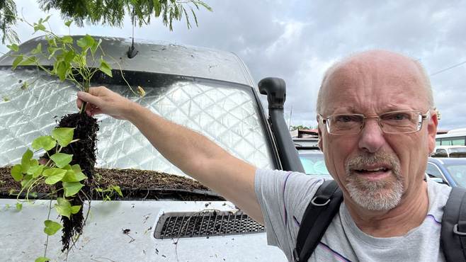 Bis zum Zollbüro ist es nicht weit, aber ich nehme mir trotzdem ein Uber-Taxi. Hab trotz Schlaftablette nicht gut geschlafen, bin müde und fühle mich krank. Eigentlich sollte gleich neben dem Zoll ein Versicherungsbüro sein, aber das gibt es anscheinend nicht mehr. Die Leute vom Zoll sind freundlich, machen meinen Papierkram auch ohne Versicherung, aber es dauert über eine Stunde, weil alle Kaffee machen und miteinander plaudern. Die Versicherung hat ein neues Büro einen halben Kilometer weiter, doch dort wollen sie keine Wohnmobile versichern, schon gar nicht ausländische. Sie schicken mich zu einem anderen Büro, wo ich um 25 Dollar eine Versicherung für einen Monat abschließen kann. Wieder mit einem Uber geht es zum Zerberus. Wegen der Proteste ist eine Hauptstraße gesperrt, wir müssen einen riesigen Umweg fahren. Der Zerberus ist in einem üblen Zustand, er hat einen Platten, ist total verdreckt und an mehreren Stellen wachsen Bäumchen aus ihm. Im Motorraum sind Spuren von Nagetieren, die reichlich Dämmmaterial gefressen haben. Es braucht mehrere lange Startversuche, bis er anspringt. Die Klimaanlage funktioniert nicht. Hinter dem Zerberus sind gut 20 Autos eingeparkt, die nun weg müssen. Das dauert ewig, denn erst mal machen hier alle eineinhalb Stunden Mittagspause und dann müssen erst die Schlüssel den Autos zugeordnet werden. Ein anderes Wohnmobil hat zwei Platte und wird unsanft mit einem Gabelstapler entfernt. Dann ist der Zerberus endlich frei. Ich fahre gleich zur Werkstatt, mit der ich für den Nachmittag einen Termin vereinbart habe. Ich habe etliche Ersatzteile mitgebracht, die eingebaut werden müssen, außerdem müssen das Motoröl und diverse Filter gewechselt werden. Ja, und natürlich müssen sie sich die Klimaanlage ansehen. Ob sich das bis zum Abend ausgehen wird? Immerhin bin ich erst um 15 Uhr eingetroffen. Alejandro, der Chef sagt, kein Problem, das geht sich locker aus, sie arbeiten ohnehin bis acht. Und sollte es sich nicht ausgehen, kann ich im Wohnmobil schlafen. Das mache ich dann auch, denn obwohl der Mechaniker bis neun gearbeitet hat, ist ein Ende nicht in Sicht. Die Nacht ist schwül und zweimal regnet es kurz. Km 5/13.752/172.625.