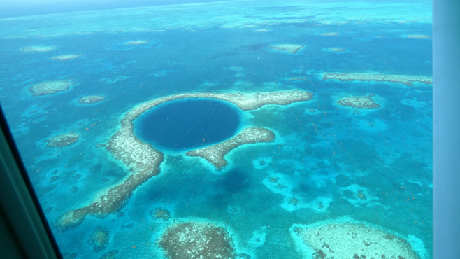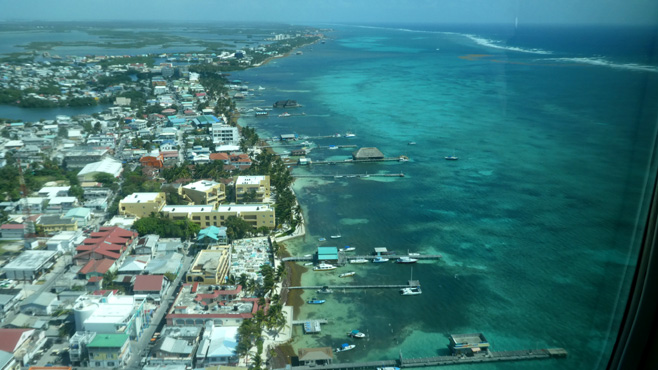 Für heute haben wir einen Rundflug zum Blue Hole gebucht. Wir fahren zum lokalen Flughafen von Belize City und zunächst sind wir die einzigen Fluggäste in der zwölfsitzigen Cessna 280. Weitere Passagiere werden in Caye Caulker und San Pedro zusteigen, die dort natürlich jeweils wieder abgeliefert werden müssen. Da wir am Nachmittag mit dem Boot nach Caye Caulker fahren wollten, frage ich mal, ob wir denn nicht auf dem Rückflug vom Blue Hole gleich dort aussteigen könnten. Das ist möglich, wir dürfen auch Gepäck mitnehmen und den Zerberus auf dem bewachten Parkplatz von Maya Island Air stehenlassen. Super, das erspart uns ein paar Stunden unnötiger Hin- und Herflieger/-fahrerei. Wir haben eine halbe Stunde, um unsere Sachen für den dreitägigen Aufenthalt auf der Insel zu packen. Auf dem Weg zum Blue Hole überfliegen wir mehrere Riffe, Inselchen und einige Atolle. Das Blue Hole ist ein kreisrundes, tiefblaues Loch mit einem Durchmesser von über 300 Metern und einer Tiefe von 125 Metern im sonst helltürkisen, seichten Meer. Es ist ein unglaublicher, fantastischer und magischer Ort! In Caye Caulker steigen wir also aus und nehmen ein Taxi zum gebuchten Hotel. Die Insel ist acht Kilometer lang und bis zu zwei Kilometer breit, es gibt keine Autos, nur Fahrräder, Motorräder und Golfwagen. Unser Taxi ist so ein Golfwagen. Der Fahrer verlangt 20 Dollar (10 Euro), was uns sehr teuer vorkommt, da er aber die einzige Fahrgelegenheit am Flughafen ist, müssen wir akzeptieren. Nach nur einem Kilometer haben wir das Hotel erreicht. Da hat der Fahrer ein gutes Geschäft gemacht! Auf Caye Caulker geht alles sehr gemächlich ab, man ist im Nu entschleunigt, man kann gar nicht anders. Es gibt viele stimmungsvolle Lokale, die Gastronomie ist sehr gut, aber teuer, die Drinks sind klein, ein Bier etwa hat nur 250 bis 283 Milliliter. Das hat vermutlich damit zu tun, dass alles schnell warm wird. Km 11/9.480/168.436.