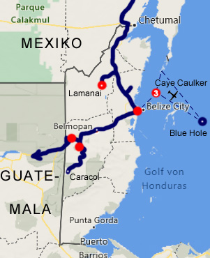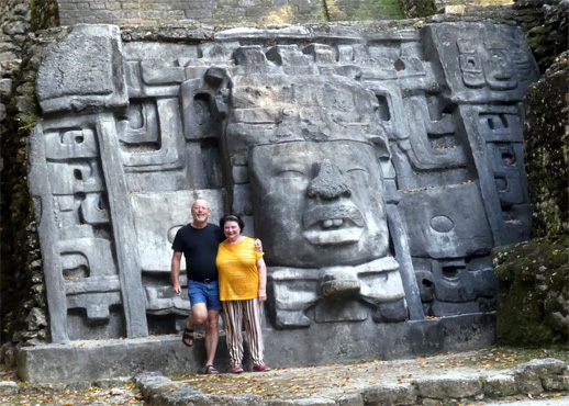 Auf mexikanischer Seite ist der Grenzübertritt unkompliziert, wenn man davon absieht, dass man sich den Zöllner suchen muss, der das TIP abschließt und eine Bestätigung über die Ausreise des Autos ausstellt. Das muss man nicht unbedingt, aber mit diesem Vorgang vermeidet man Forderungen des mexikanischen Zolls, wenn das TIP in zehn Jahren abläuft. Die Einreise nach Belize ist leicht chaotisch: Zunächst lassen sie einen bis zum Schranken vorfahren, um einem zu sagen, dass man zurückschieben, das Auto am Parkplatz abstellen und die Formalitäten in einem Gebäude erledigen muss. Das Zurückschieben ist natürlich nicht so einfach, wenn schon andere Fahrzeuge hinter einem warten. Am Immigration-Schalter gibts gleich Ärger, weil wir keinen Einreisestempel von Mexiko im Pass haben. Das hat die Mexikaner vorhin nicht gestört, aber die Belizer stört das und wir werden zur mexikanischen Grenzstelle zurückgeschickt. Die dortige Beamtin blättert in unseren Reisepässen und - unglaublich! - findet die Stempel. Sie sind kaum sichtbar, da war die Stempelfarbe wohl ziemlich aus. Nun wieder zur belizischen Grenzstelle, wo die Immigration-Officerin mault, weil man die Stempel nicht lesen kann, aber uns dann doch einreisen lässt. Nun reist auch noch das Auto ein und wird kurz von einer netten Zöllnerin angesehen. Sie interessiert sich gar nicht für unsere Lebensmittel, die man nicht einführen dürfte, sondern sieht sich die Fotos von unseren Enkelkindern an, die wir im Wohnmobil aufgehängt haben. Wir bezahlen noch die Einreisegebühr, sind nun fertig, glauben wir, und fahren wieder zum Schranken. Dort lässt man uns und alle hinter uns aber wieder zurückschieben, weil der Zerberus noch nicht desinfiziert ist. An der Desinfektionshalle im Niemandsland sind wir vorgeigefahren, weil das alle getan haben. Wer nur einen Tag nach Belize rüberfährt, braucht das nicht, wer länger bleibt, muss sich um 10 Euro besprühen lassen, erfahren wir. Wie sinnvoll! Für den triefnassen Zerberus öffnet sich nun endlich der Schranken. Wir wechseln noch Geld und schließen eine Versicherung ab. Der Grenzübertritt hat alles in allem zwei Stunden gedauert. Belize sieht auf den ersten Blick ein wenig ärmlicher als Mexiko aus, ist aber jedenfalls sauberer und ordentlicher. Es wird Englisch gesprochen, von den Geldscheinen lächelt Queen Elizabeth und die Geschwindigkeitsbeschränkungen sind in Meilen pro Stunde angegeben: im Ortsgebiet 25 (40 km/h) und außerhalb 55 (89 km/h) und alle scheinen sich daran zu halten. Die meisten fahren sogar noch langsamer, kriechen dahin, keiner scheint es eilig zu haben. Die Straße nach Lamanai, wo wir uns die Maja-Ruinen ansehen wollen, soll recht schlecht sein, meint unser Reiseführer, weswegen wir überlegen, von Orange Walk Town aus mit dem Boot dorthin zu fahren, doch heute fährt kein Boot mehr. Wir bringen aber in Erfahrung, dass die Straße über San Felipe, die zwar einen kleinen Umweg darstellt, recht gut ist. Und so ist es auch, wir kommen sogar noch so zeitig in Lamanai an, dass wir uns heute noch der Archäologie widmen können. Hier befinden sich neben verschiedenen anderen Ruinen drei Maya-Pyramiden, die von dichtem Dschungel überwuchert waren. Man hat jeweils eine Seite der Pyramiden von Bäumen befreit, aber der Urwald reicht bis dicht an die Ruinen heran, wodurch sich eine magisch-mystische Stimmung ergibt. Der Dschungel ist ein dichtes Gewirr von großen Bäumen, verschiedenen Palmen, Farnen und Pflanzen, die man bei uns als Blumenstock kaufen kann. Lianen hängen herab, Nasenbären tummeln sich und hoch oben im Geäst hüpfen Affen herum. Des spektakulärste Bauwerk hier ist die Maskenpyramide, an deren Vorderseite zwei riesige Reliefs von Köpfen prangen. Welch faszinierender Ort! Wir übernachten unweit von den Ruinen am Seeufer, ein Pärchen aus Kanada teilt den Platz mit uns. Km 187/9.257/168.213.