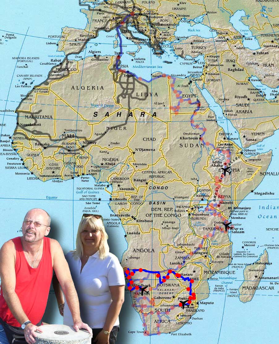 Meine 23. Afrikareise führt mich von Johannesburg, wo ja unser Toyota wartet, durch den Krüger-Nationalpark nach Zimbabwe. Hier möchten wir noch einmal die Victoria-Fälle, diesmal von der anderen Seite, sehen. In Botswana geht des durch den Chobe-Nationalpark ins Okavango-Delta und an den Rand der Kalahari. Nach einer neuerlichen Fahrt durch das Kaokoveld werden wir unser Buschtaxi noch einmal in Windhoek stationieren.