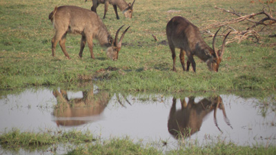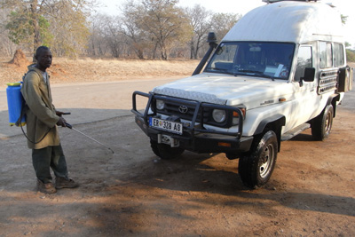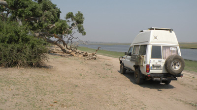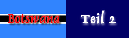 ... auf botswanischer Seite 15 Minuten (und 120 BWP = 10,84 EUR) dauern. Da unser Versuch, zwischen der Grenze und dem Chobe-Nationalpark einen Nachtplatz zu finden, scheitert, suchen wir uns ein Camp in Kasane. Wir übernachten im Thebe-Camp (S17 47.189 E25 10.972, 69 BWP = 7,64 EUR p.P.), wo wir im Restaurant ein kühles Bier trinken und dann unserem Kühlschrank viel Gin und nicht ganz so viel Tonic entnehmen. Km 283/3.049/39.514. Montag, 27. September 10, Tag 12, Chobe-Nationalpark Die Strecke durch den Chobe-Nationalpark bis Ngoma-Bridge fahren wir am Chobe-River entlang. Bei der Parkeinfahrt (S17 50.630 E25 08.560) wird das Auto desinfiziert, um das Einschleppen von Maul-und-Klauenseuche zu verhindern. Am Fluss wimmelt es nur so von Tieren: Zebras, Elefanten, Antilopen, Büffel, Gazellen und viele Vögel, etwa Löffelreiher, Adler und Geier. Von Ngoma-Bridge bis zum Gocha-Gate (S18 23.270 E24 14.720) ist die Strecke meist tiefsandig, sie begleitet zu Beginn die neue Straße, die aber noch nicht befahren werden darf, nicht einmal auf dem kurzen schon asphaltierten Teil. Die Fahrt durch den südlichen Chobe-Nationalpark hat auch dieses Mal nur wenige Tierbeobachtungen zu bieten. Heuer sind sogar die Wasserlöcher in Savuti trocken, wo sich voriges Jahr sehr viele Elefanten sammelten. Dafür messen wir hier unseren bisherigen Temperaturrekord: 39 Grad. Kurz vor Sonnenuntergang verlassen wir den Park durch das Mbabe-Gate (S19 06.016 E23 59.106) und wir übernachten auf einem schon vom Vorjahr bekannten Platz im Busch. Das Wasser in unserem unter der Bodenplatte angebrachten Wassertank hat sich im Lauf der Fahrt auf Außentemperatur erhitzt und ist zum Duschen leider zu heiß. Km 252/3.302/39.766. |