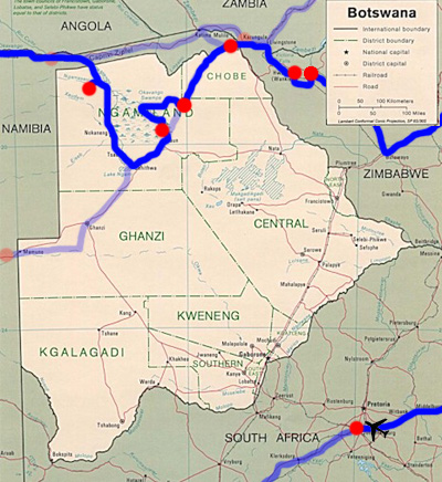 Mittwoch, 29. September 10, Tag 14, Tsodilo-Hills Nach ein paar kleineren Reparaturen fahren wir nach Maun, wo wir unsere Vorräte auffrischen, ins Internet-Cafe gehen und ein Reifenventil wechseln lassen. Leider funktioniert auch hier die botswanische SIM-Karte nicht, Susis Anrufe kommen zwar durch, aber wir hören sie nicht. In Sehitwa, wo wir von der nach Südwesten führenden Straße nach Norden abbiegen, essen wir in einem sehr einfachen Restaurant zu Mittag. Während mir das Rindfleisch mit Bohnen halbwegs schmeckt, findet Sabine ihren Maispudding mit Bohnen eher nicht so lecker. Bei einer Polizeikontrolle meint der Polizist, er müsse uns wegen der fehlenden Nummerntafel bestrafen. Ich kann ihn jedoch davon überzeugen, dass das dann aber für ihn mit viel Arbeit verbunden ist, weil er dann ja eine Verlustanzeige schreiben muss, und so vereinbaren wir, dass die Nummerntafel erst in Namibia verloren gehen wird. Auf der Weiterfahrt beschließen wir, einen Abstecher zu den Tsodilo-Hills zu machen, die etwa 40 Kilometer westlich der Straße liegen. Inmitten einer riesigen Ebene liegen vier Hügel, die wegen ihrer Felsmalereien bekannt sind. Erstaunlicher Weise müssen wir keinen Eintritt bezahlen, sondern nur die obligate Führung (50 BWP = 5,50 EUR). Unsere Führerin zeigt uns die besten Malereien. An malerischen Plätzen tummeln sich an den Felswänden Giraffen, Antilopen und Jäger, sogar Pinguine und Wale sind zu sehen. Die Führerin gibt das Alter der Malereien mit 10.000 Jahren an, während unser Reiseführer die ältesten mit 1.500 Jahren datiert. Im Vergleich mit Malereien aus der Sahara sehen sie jedenfalls sehr viel jünger aus, so dass wir eher dem Reiseführer Glauben schenken. Wir übernachten wieder im Busch, der hier ziemlich dicht ist. Erst eine Fläche, die vor einiger Zeit abgebrannt wurde, lässt uns eindringen. Hier gibt es erstmals ein Lagerfeuer. Km 509/3.989/40.454. Donnerstag, 30. September 10, Tag 15, Rundu Die Grenze nach Namibia ist schnell erreicht, die Ausreise aus Botswana erfolgt in rekordverdächtigen fünf Minuten. |