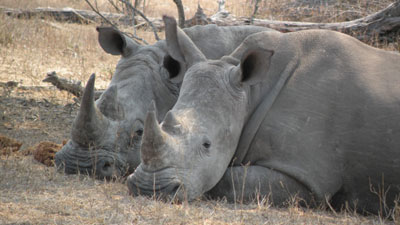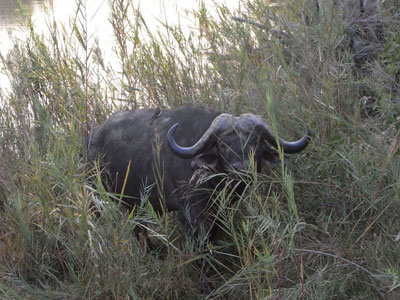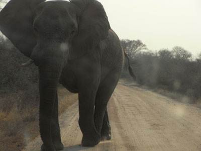 Dienstag, 21. September 10, Tag 6, Krüger-Nationalpark Wir stehen schon um 5 Uhr 30 auf, um bei Sonnenaufgang an den ersten Wasserstellen zu sein. Das lohnt sich, denn wir treffen an einer Brücke über einen wenig Wasser führenden Fluss auf zwei Büffel. Kurz darauf steht am Wegrand ein riesiger Elefant, dahinter im Busch weitere. Auch auf der anderen Seite der Straße stehen Elefanten. Sind wir etwa mitten in eine Herde geraten? Es scheint ganz so, denn der Bulle, den wir als erstes gesehen haben, geht auf der Straße auf uns zu. Zunächst finden wir das noch recht toll, doch als er dann nur mehr zwei Meter neben dem Auto steht und die Ohren abspreizt, durchfährt uns ein mächtiger Adrenalinstoß und wir entschließen uns zur Flucht per Vollgas. Im Verlauf des Vormittages sehen wir dann noch die üblichen Tiere, gegen Mittag immer weniger und als wir glauben, alle haben sich in der Mittagshitze verdrückt, entdecken wir im Schatten eines Baumes zwei Breitmaulnashörner. Dann treffen wir bei einem Wasserloch auf ein Krokodil, das mit einer Schildkröte schäkert. Und am frühen Nachmittag gibt es ein weiteres Highlight: Ein paar Löwen räkeln sich genüsslich in der Sonne. Im Satara-Camp (S24 23.580 E31 46.779) duschen wir (erstaunlicherweise gibt es keinerlei Zugangskontrollen) und etwa eine Stunde vor Sonnenuntergang verlassen wir den Park. Etwas außerhalb finden wir eine Piste weg von der Parkzufahrt in den Busch. Sie führt an ein großes Wasserloch, an dem ich gerne übernachtet hätte. Doch Sabine findet in Anbetracht der vielen Tierspuren und -exkremente (auch von Elefanten) die Idee nicht so gut, weshalb wir uns auf einen Platz etwa 200 Meter neben der Wasserstelle einigen. Ganz glücklich ist Sabine noch immer nicht, liegt doch auch hier überall Elefantenkacke und eine große Herde Springböcke und ein paar Zebras sind in Sichtweite. Wild campieren im Busch geht halt nicht anders. Km 248/935/37.400.