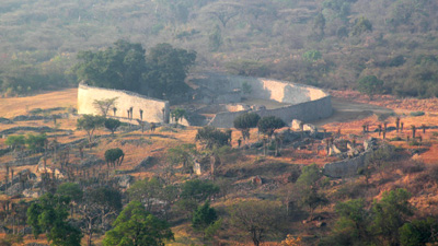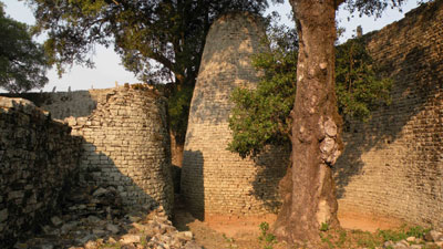 ... sind jene auf zimbabwischer Seite chaotisch und nehmen zwei Stunden in Anspruch. Wir bezahlen für die Visa 30 USD (23,70 EUR) p.P. und 700 ZAR (78 EUR) für Carbontax, Straßenbenützungsgebühr und Versicherung, sowie 80 ZAR (8,90 EUR) an Brückenmaut. Wenigstens die Geldwechslerei fällt weg, seit der US-Dollar offizielle Währung und auch der südafrikanische Rand überall akzeptiert ist. Zuvor musste man zu schlechtem Kurs Trillionen von Zimbabwe-Dollar kaufen, die schon am nächsten Tag kaum mehr etwas wert waren; die Inflation betrug bis zu mehreren Millionen Prozent! Die Menschen hier sind offensichtlich arm, aber sehr freundlich. Zuerst geht es durch recht eintöniges Buschland, doch dann säumen kleine Felsberge die Strecke, die Vegetation wird auch grüner, nur die Laubbäume tragen Herbstkleid, obwohl hier ja Frühling ist. Wir fahren ohne wesentliche Aufenthalte - ausgenommen ein Halt mit nach Verhandlung 10 USD (7,90 EUR) Radarstrafe - nach Great Zimbabwe, wo wir einen Teil der Ruinenanlagen besichtigen (15 USD = 11,85 EUR p.P.). Die Bauten, die hier ab dem 6. Jahrhundert n. Chr. über viele Jahrhunderte entstanden sind, geben den Archäologen große Rätsel auf, so dass unser Reiseführer mit wenig Fakten, dafür aber vielen Vermutungen und Thesen aufwartet. Wir übernachten als einzige Gäste auf dem Campingplatz am Fuße der Ruinen (5 USD = 4 EUR p.P., bis auf Sanitärräume sehr sauber). Km 367/1.759/38.224.